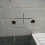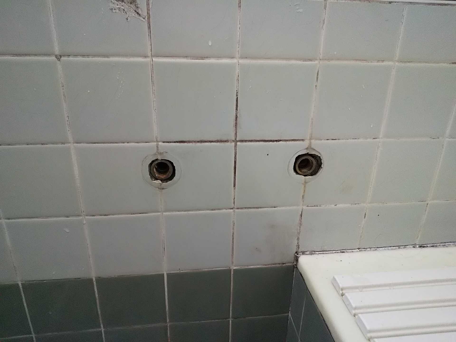 既存水栓を取り外すと、壁面の取付部周辺に汚れや跡が残っている状態でした。このままでは仕上がりに影響するため、清掃を行ってから新しい水栓を設置しています。