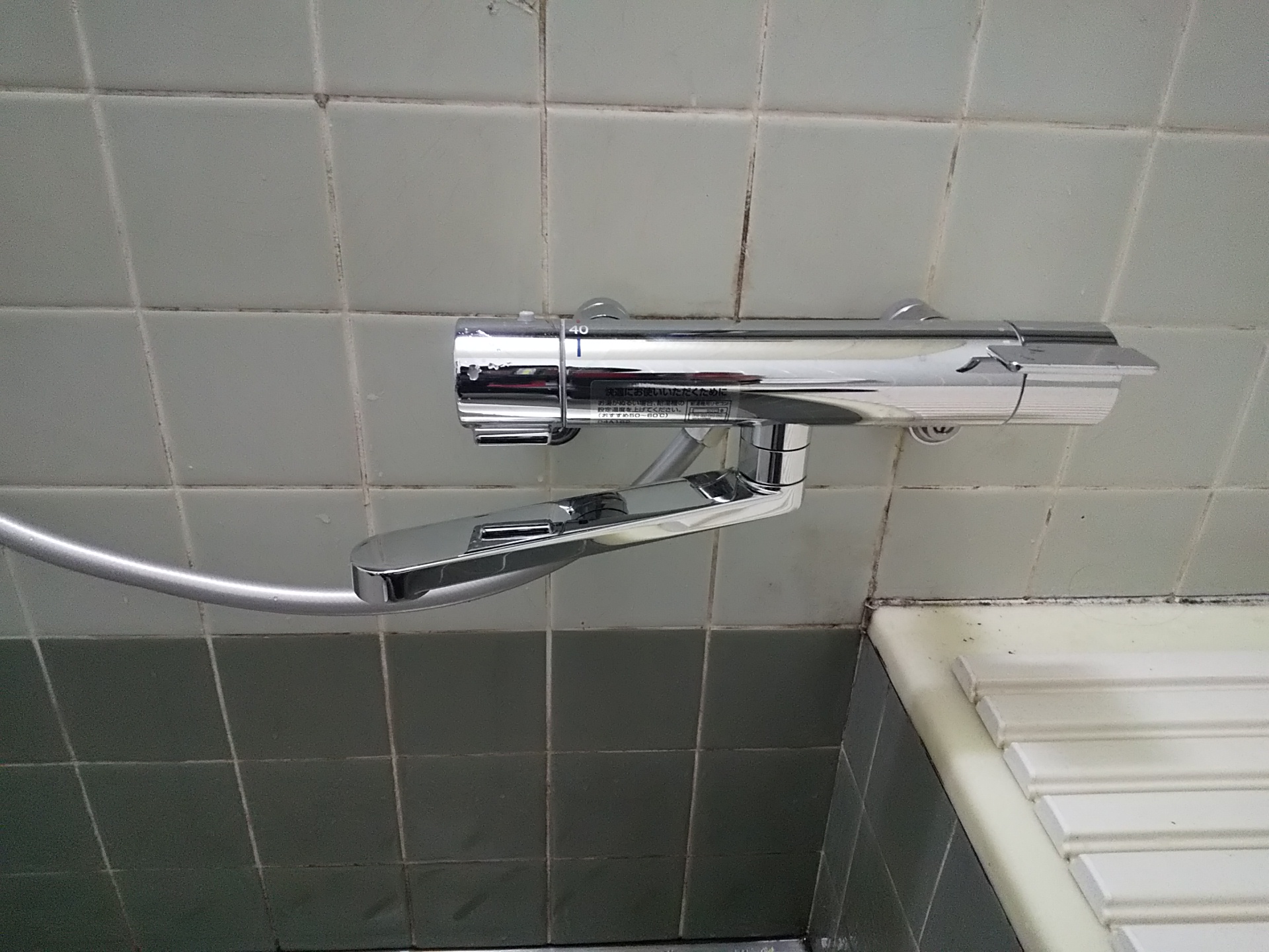 既存のTOTO水栓を撤去し、TOTOのサーモスタット式水栓【TBV03401J1】へ交換しています。温度調整機能付きのため、従来より安定したお湯の供給が可能なモデルです。