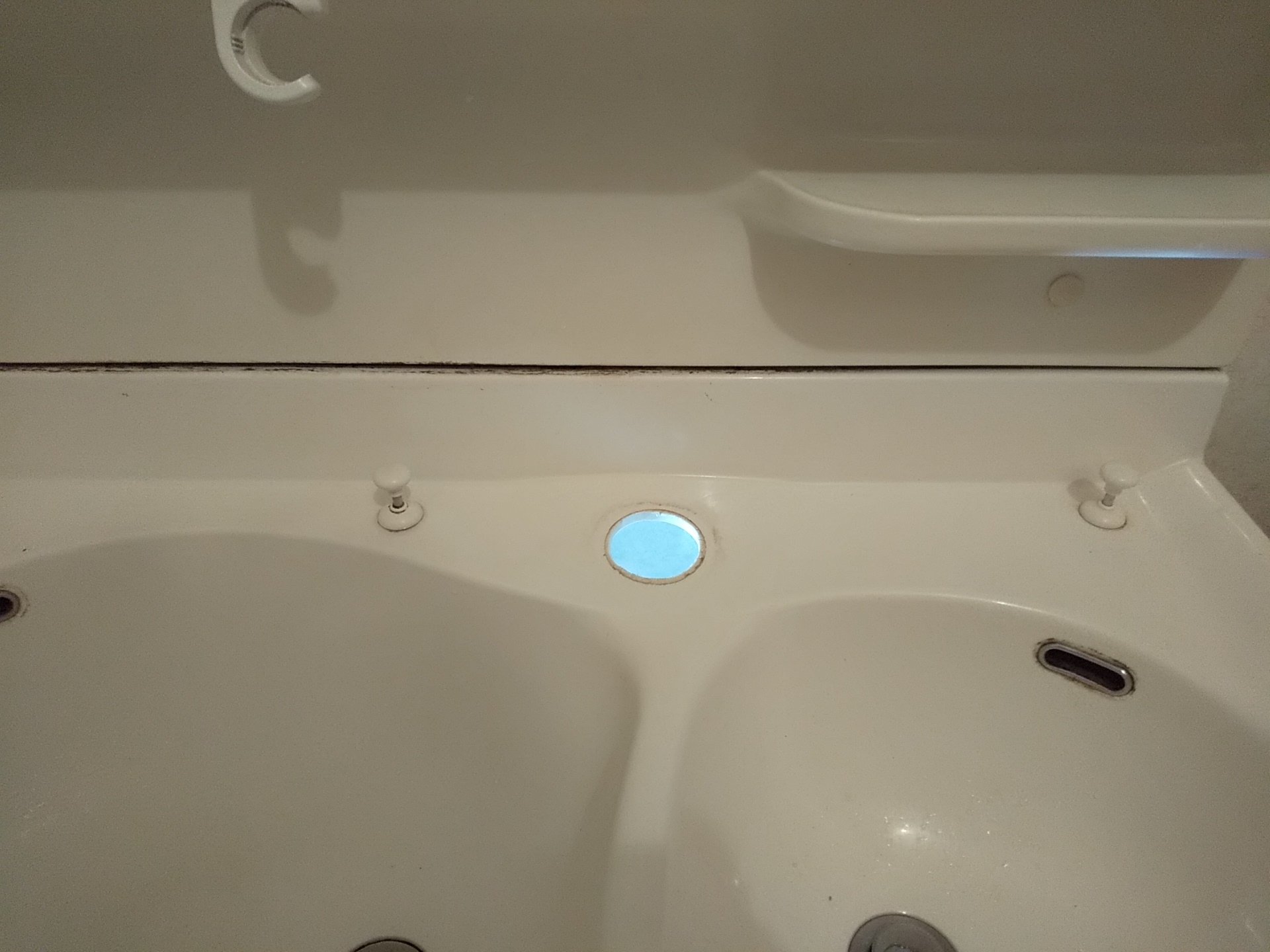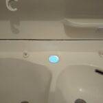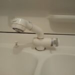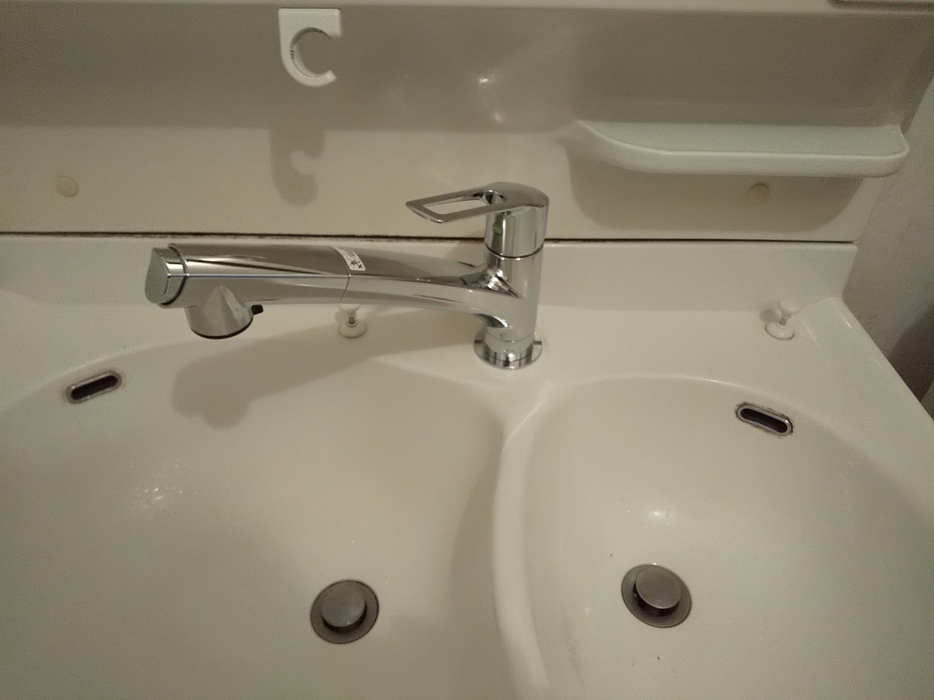 古い洗面台の場合、取付穴のサイズが現行品と合わないケースがあり、このあたりの収まりは毎回確認が必要です。今回はアダプターを使いながら、ガタつきが出ないようしっかり固定しています。ここは意外と仕上がりに影響が出る部分です。