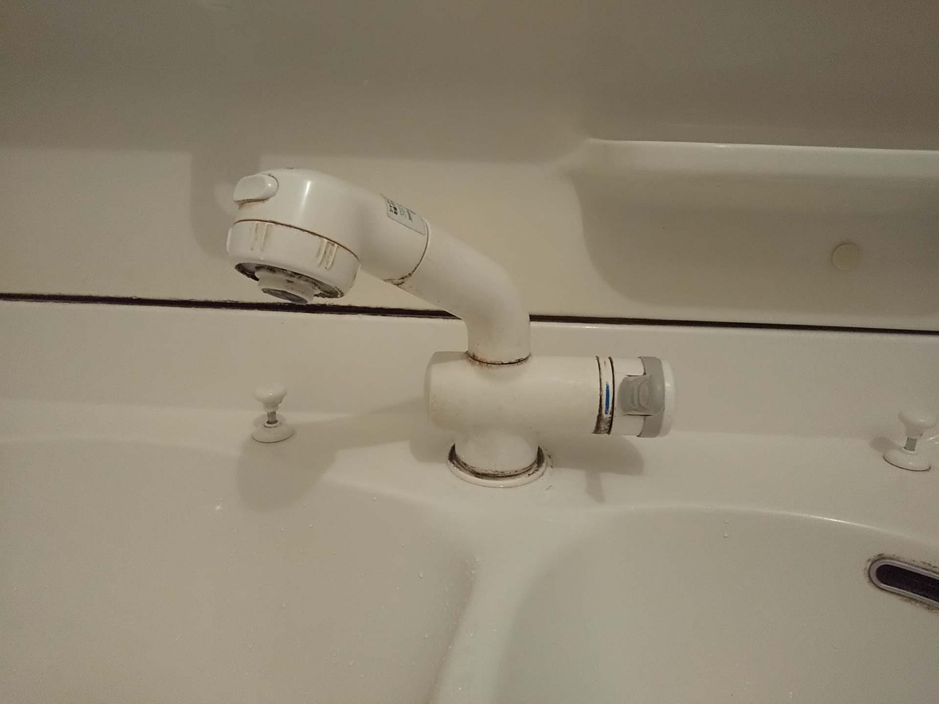 吐水部や本体周りからのにじみがあり、使用時に水漏れが確認できる状態でした。かなり古いタイプの水栓で、内部劣化が進んでいる印象です。