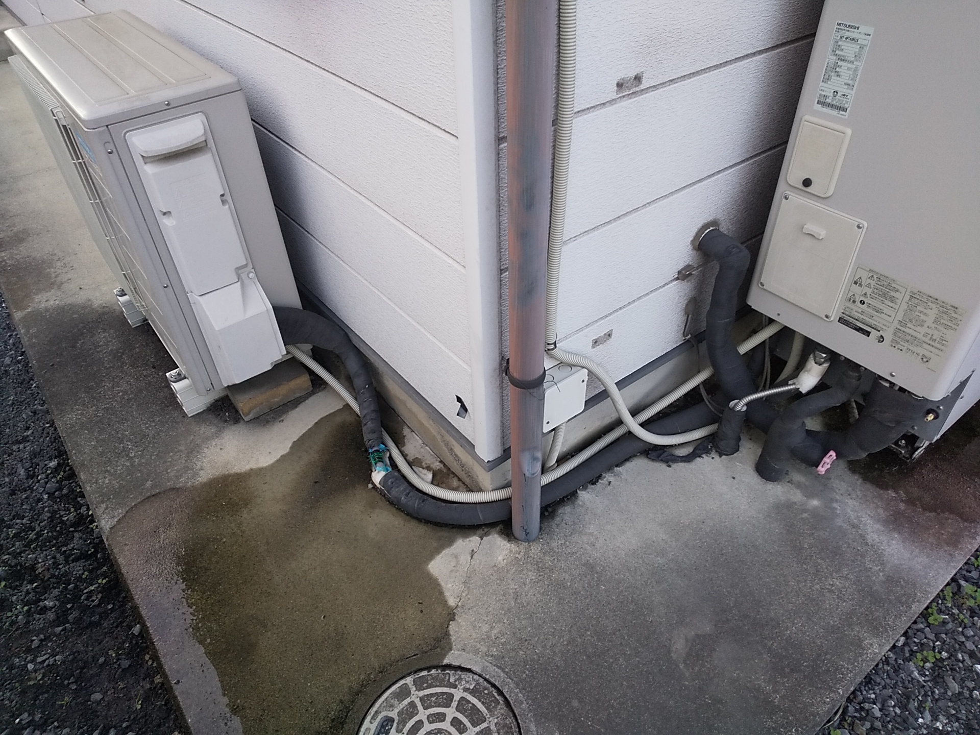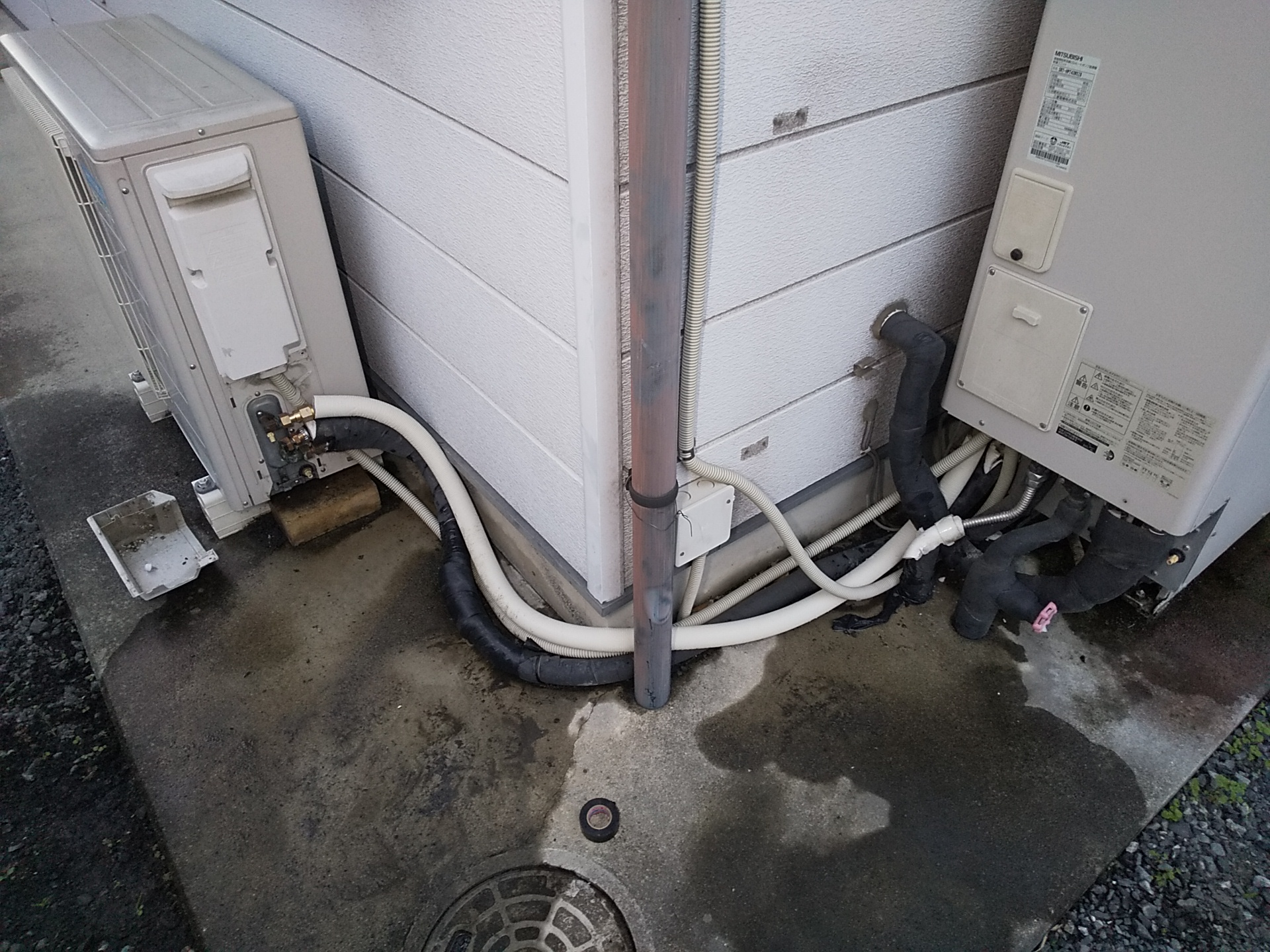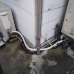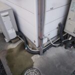 ご相談内容は「屋外の配管まわりが濡れている気がする」というもの。現地に伺って確認すると、エコキュート本体まわりの配管付近に水がにじんだ跡があり、地面も常に湿っている状態でした。