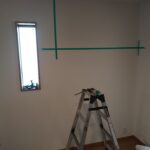 まずは壁面に位置出しを行い、水平や高さを確認しながら取付位置をマーキング。