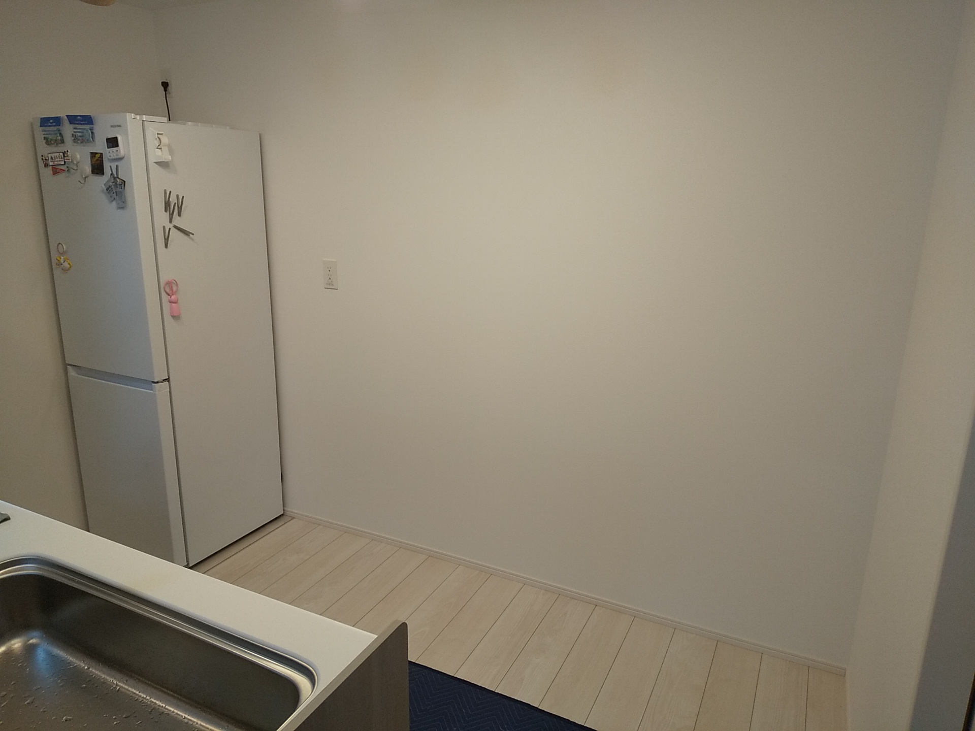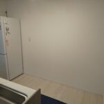 まずは設置予定の壁面を確認し、寸法や通路幅、冷蔵庫との位置関係をチェック。コンセントの位置も事前に確認しながら、使い勝手をイメージして取付位置を決めていきます。何もない状態からの設置なので、最初の位置決めが意外と重要な作業です。吊戸棚の下地位置もしっかりと確認していきます。