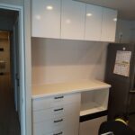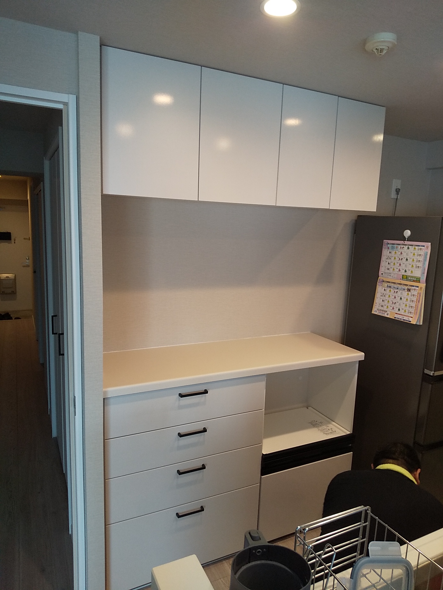今回の工事では、お客様ご用意のカップボードを設置させていただきました。