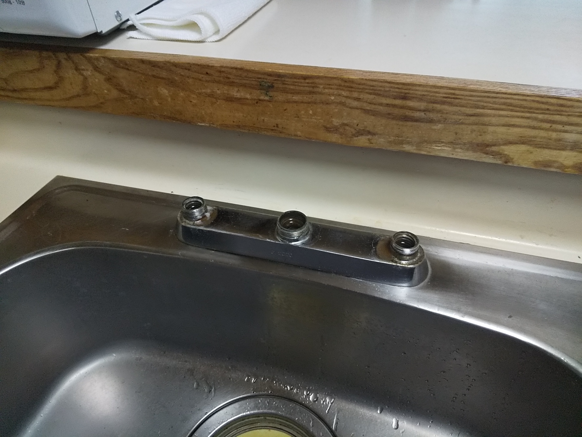 台付3穴から2穴のシングルレバー(混合水栓)に交換です。台は被せて元の中央穴を隠せるので見た目もスッキリしました!