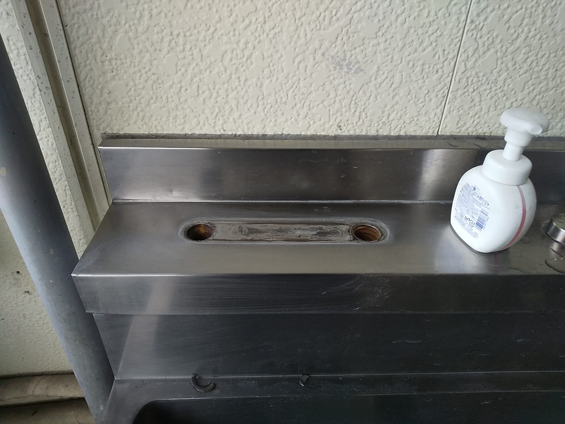 新しく取り付けた水栓は同じく台付の混合水栓ですが、ハンドルが1つになっている、主流のタイプへの交換です。湯水の調整がハンドル左右で、しかもエコシングルという、カチッっという音が鳴り、お湯か水が簡単に切り替えられるハンドルです。2ハンドルによる調整を行うよりはるかにガスと水の節約に貢献します!2ハンドルをお使いの方にはかなりおすすめです。