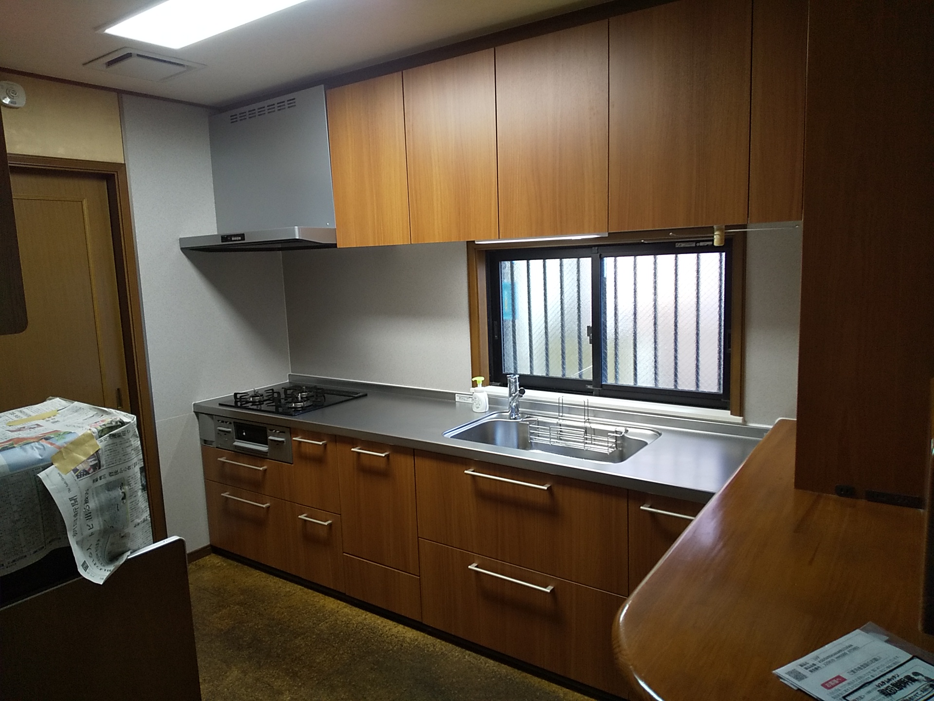 既存キッチンを解体撤去し、古いお家だったので壁下地が少し心もとない状態でした。そのため、下地ボードをしっかりと貼りなおさせていただき、新しいキッチンを設置いたしました!