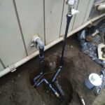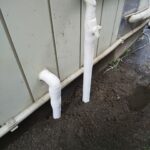 外部配管はスペースも限られ、既存のルートや立ち上がり位置も考慮しながらの作業になります。勾配や接続部の締め込みをしっかり確認し、止水チェックを実施。漏れが完全に止まっていることを確認できました。