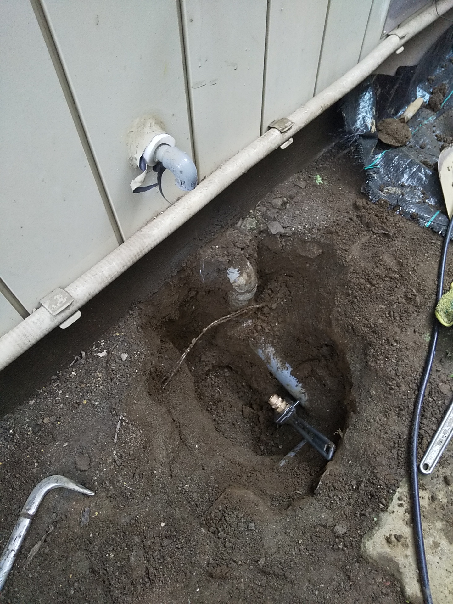 外壁沿いの地中からじわじわと水がにじみ出ているとのことでご連絡をいただき、現地確認。掘ってみると、給水管の一部が経年劣化により傷み、そこから漏水している状態でした。