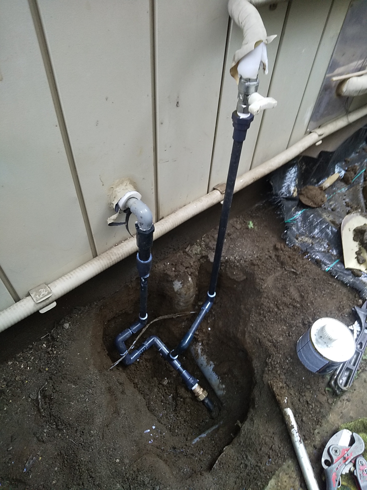 外部配管はスペースも限られ、既存のルートや立ち上がり位置も考慮しながらの作業になります。勾配や接続部の締め込みをしっかり確認し、止水チェックを実施。漏れが完全に止まっていることを確認できました。