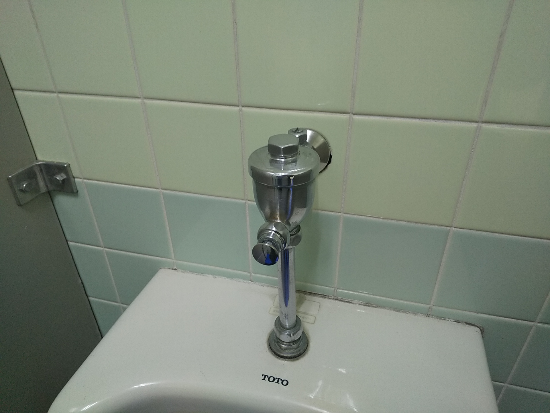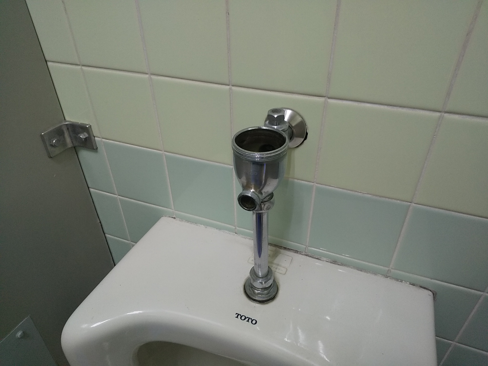 男子トイレでは、小便器のフラッシュバルブ故障による水漏れが発生。