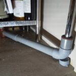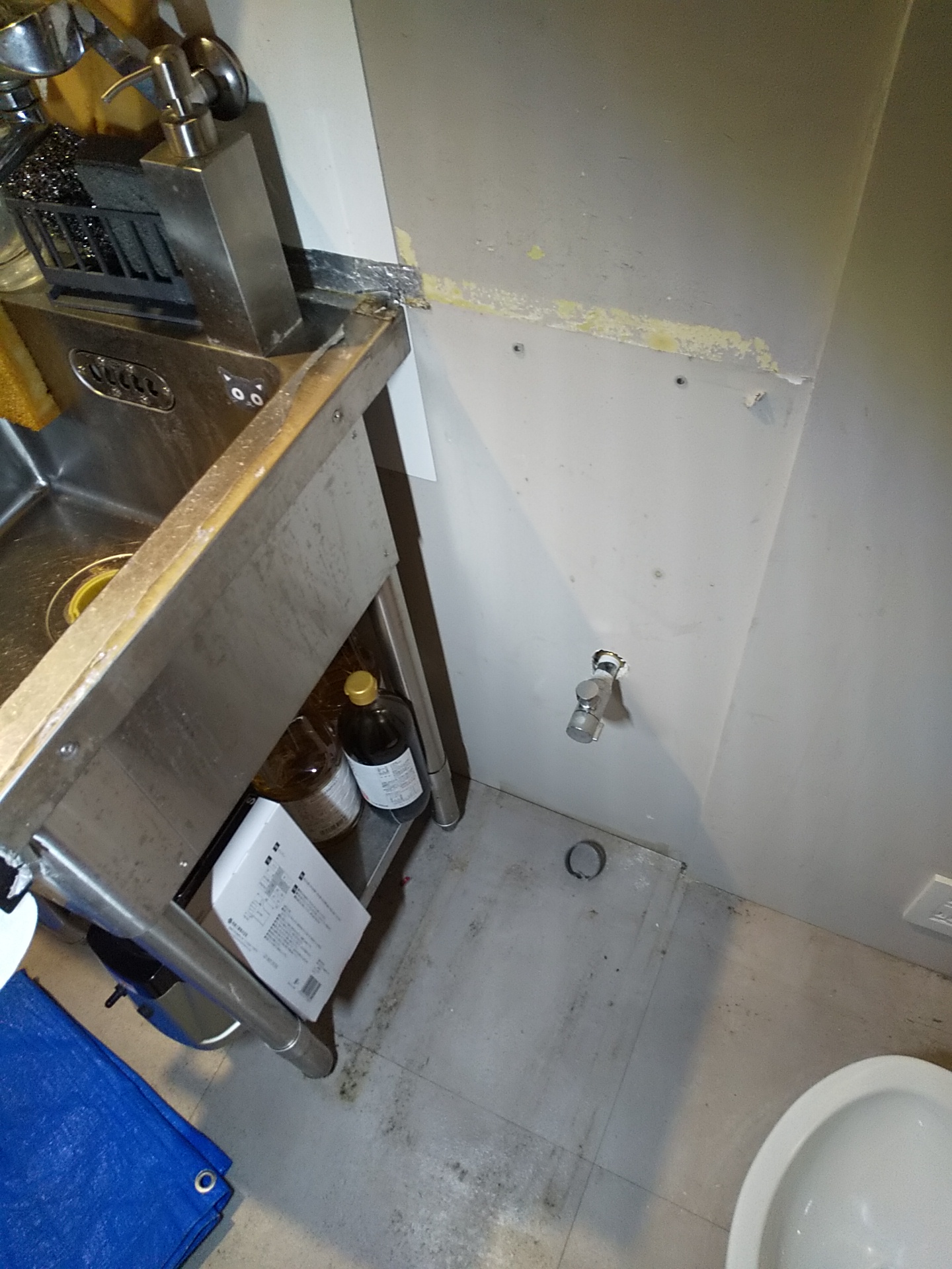 作業では、既存配管から分岐を取り、床下へ排水管を延ばしています。厨房内ということもあり、今後の清掃性や動線も考えながら配管経路を決めました。露出配管ですが、できるだけ邪魔にならないようにまとめています。