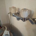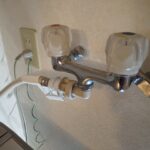 水漏れ箇所は、2ハンドル混合の洗濯機用水栓の吐水口根元からでした。樹脂製だったため、経年劣化による亀裂があり、ハンドルを回した際の水圧で染み出てきてしまう状態です。