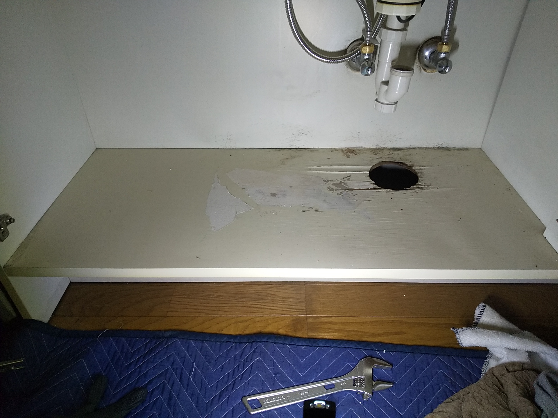 今回は洗面台の水栓交換工事と、下部収納内の床板補修を行いました。